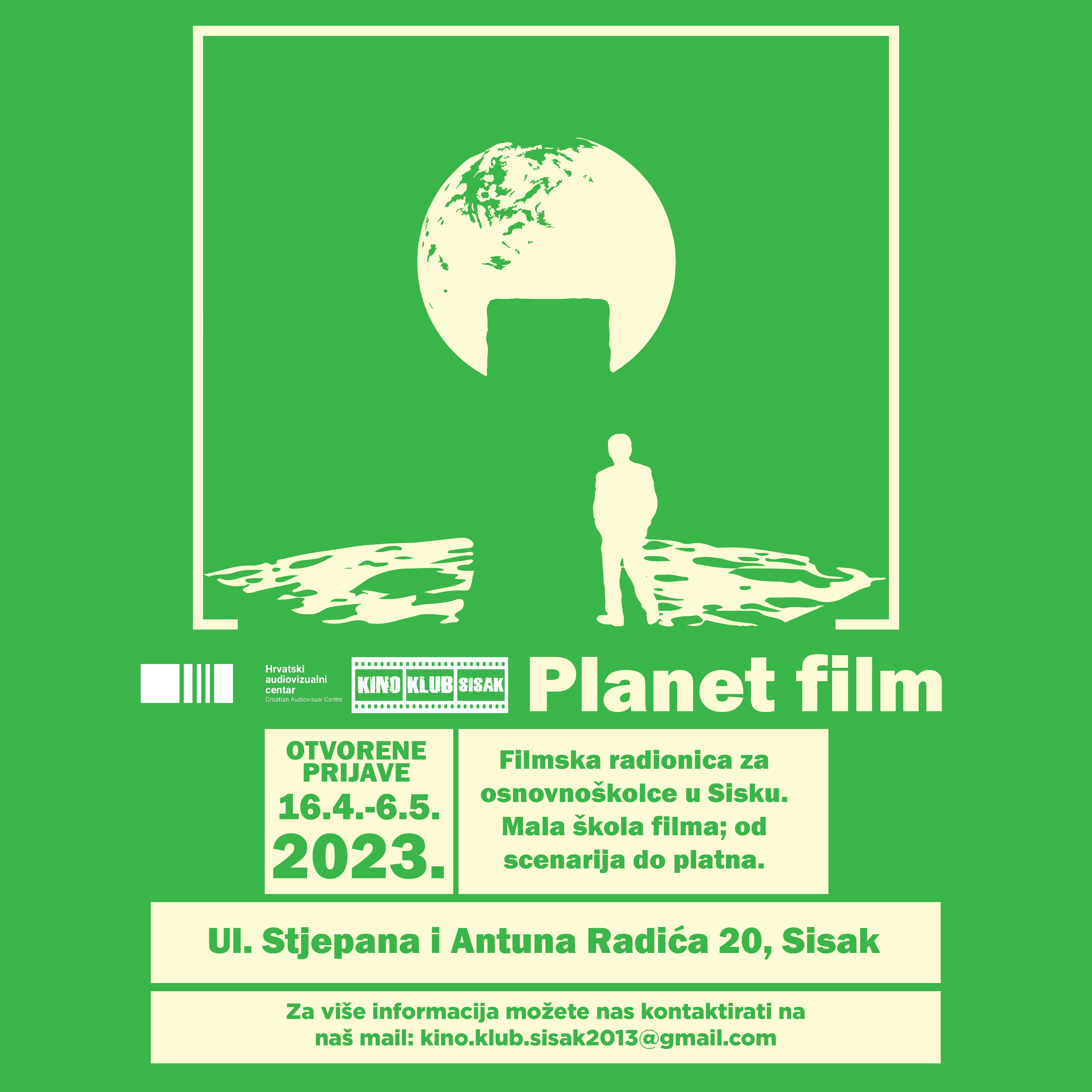 Članovi Kino kluba Sisak vas pozivaju na radionice koje se provode u okviru projekta “Planet film” koji ujedno podupire i Hrvatski audiovizualni centar. Planet film, filmska je radionica za osnovnoškolce u Sisku te funkcionira poput male škole filma kroz teoriju i praksu. Polaznici na radionicama uče osnovne pojmove filmske struke te se upoznavaju s procesom stvaranja filmskog djela, a zatim i sami snimaju kratkometražni igrani i/ili dokumentarni film uz podršku mentora.